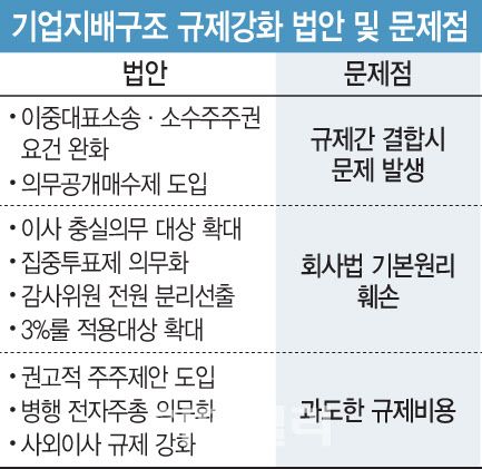 건의서는 기업지배구조 규제강화 법안의 가장 큰 문제로 규제 간 결합시 예상하지 못한 파급력이 발생하는 점을 지적했다. 기존 규제에 새로운 규제가 더해지는 경우 기업 경영 자체가 위협받는 상황이 발생할 수 있다는 것이다.