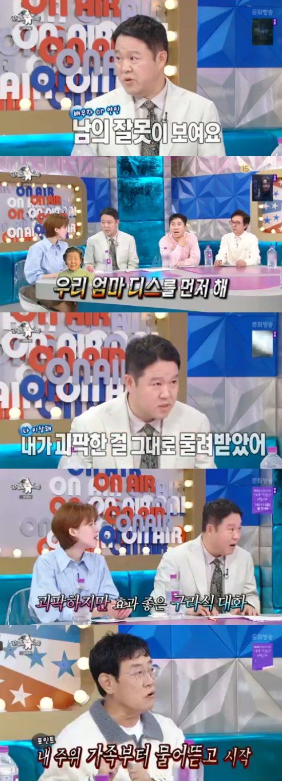 그러자 김구라는 또 "저는 아내한테 어떤 지적을 할 때 우리 어머니 디스를 먼저 한다. 그러면서 아내 지적을 하면 잘 통한다"면서 자신만의 대화방법을 전해 웃음을 자아냈다.