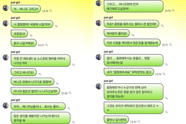 하니는 국회 출석 이유에 관해 "걱정 안 해도 된다. 스스로랑 멤버들, 그리고 버니즈(팬덤명) 위해서 나가는 것"이라고 설명했다.