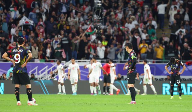 6일(현지시간) 카타르 알라이얀 아흐마드 빈 알리 스타디움 열린 2023 아시아축구연맹(AFC) 아시안컵 4강전 한국과 요르단 경기. 요르단 무사 알타마리에게 두번째 골을 허용한 대표팀 선수들이 허탈해 하고 있다. 사진=연합뉴스