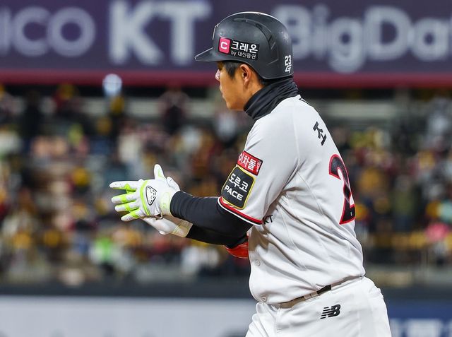 지난해 11월 10일 오후 경기도 수원 케이티위즈파크에서 열린 2023 KBO리그 한국시리즈 3차전 kt wiz와 LG 트윈스의 경기에서 5회말 2사 1, 2루 kt 조용호가 역전 1타점 적시타를 치고 손뼉을 치고 있다. / 연합뉴스
