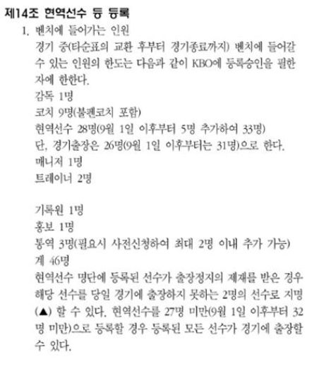 2010년 한국시리즈(KS)를 앞두고선 엔트리에 없는 양준혁을 더그아웃에 두겠다는 선동열 당시 삼성 라이온즈 감독과 이를 반대하는 김성근 당시 SK 와이번스 감독이 정면충돌하기도 했다. 그 결과 "원칙은 원칙"이라며 불허 입장을 밝힌 김 감독의 뜻대로 양준혁은 KS 더그아웃에 앉지 못했다. 이처럼 포스트시즌(PS)에서 미등록 선수의 더그아웃 출입은 만만하게 볼 사안이 아니다. 최근엔 비교적 엄격하게 관리하는 추세이기도 하다. 올 시즌만 하더라도 지난 8월 이후 KBO가 각 구단에 관련 내용을 재공지한 것으로 알려졌다.