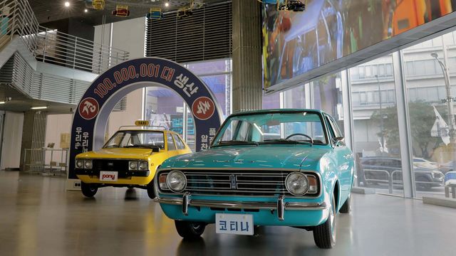 전시장 1층에 전시된 코티나 마크2와 포니 에콰도르 택시. / 현대자동차