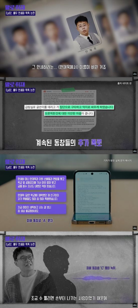 공개된 영상에서는 지난달 온라인 커뮤니티에 올라온 폭로글로 불거진 안세하의 학폭 의혹과 관련, 최소 3명 이상의 피해 동창생을 확보했다고 알렸다. 또한 익명으로 제보를 전한 이들의 피해 장소와 시기들이 일치한다고 덧붙였다.