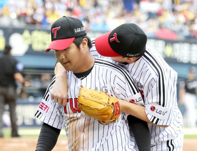 2024 프로야구 KBO 포스트시즌 LG트윈스와 kt위즈의 준플레이오프(준PO) 2차전 경기가 6일 오후 서울 잠실야구장에서 열렸다. 5회초 2사 장성우의 타구를 처리한 3루수 문보경에게 임찬규가 다가가 끌어안고 있다. 잠실=김민규 기자 mgkim1@edaily.co.kr /2024.10.06/