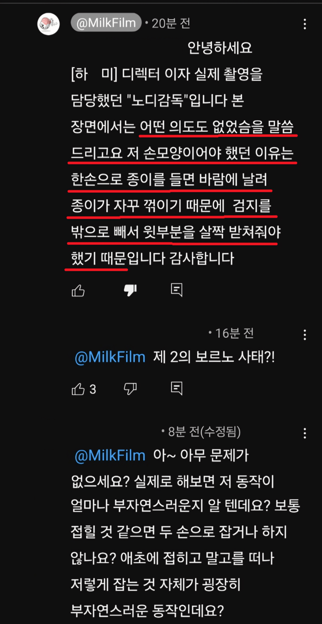 어제 이 손가락 움짤로 남초 커뮤니티에서 논란이 일자 촬영 감독이 해명글을 올렸다