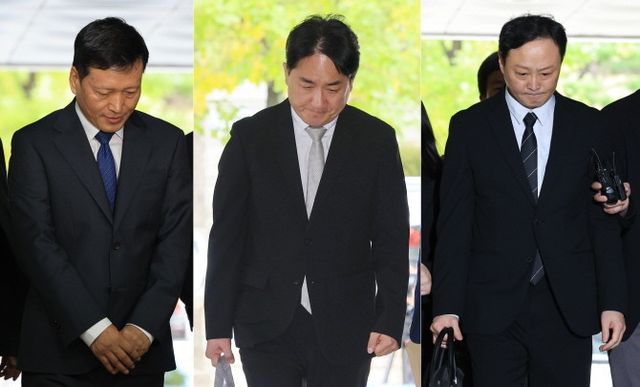 구영배 큐텐 그룹 대표(왼쪽부터), 류화현 위메프 대표, 류광진 티몬 대표가 10일 오전 서울 서초구 서울중앙지방법원에서 열린 구속 전 피의자 심문(영장실질심사)에 출석하고 있다. © 연합뉴스