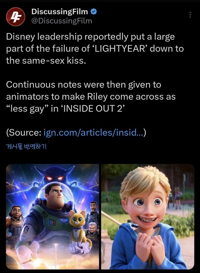 디즈니 경영진은 ‘버즈 라이트이어’의 실패의 상당 부분을 동성 키스 탓으로 돌린 것으로 알려졌습니다.