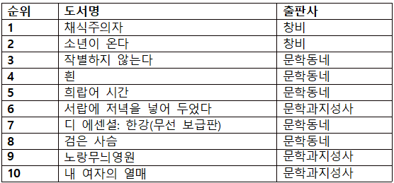 노벨문학상 수상 이후 한강 작가의 도서 판매순위