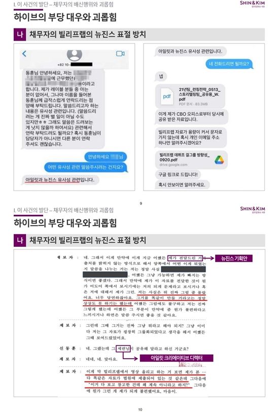그러면서 "명백한 사실이 있음에도 빌리프랩은 표절의혹이 사실이 아니라고 지속적으로 부인하고 하이브는 이를 방치했다. 민희진 전 대표는 지난 4월 3일 '아일릿의 뉴진스 카피'에 대해 내부적으로 문제제기를 하였는데, 이러한 문제 제기가 정당하였음이 객관적 증거에 의해 명확히 드러난 것"이라며 "이로써 하이브의 감사는 정당성이 전혀 없는 불법감사임이 다시 한번 확인되었다"고 설명했다.