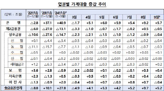 11일 금융위원회와 금융감독원의 ‘9월 중 가계대출 동향’에 따르면 지난달 금융권 주택담보대출(주담대) 증가 폭은 6조9000억원으로 전달의 8조5000억원보다 1조6000억원 감소했다. 신용대출 등 기타 대출은 전월 대비 1조7000억원 줄며 감소세로 전환했다.