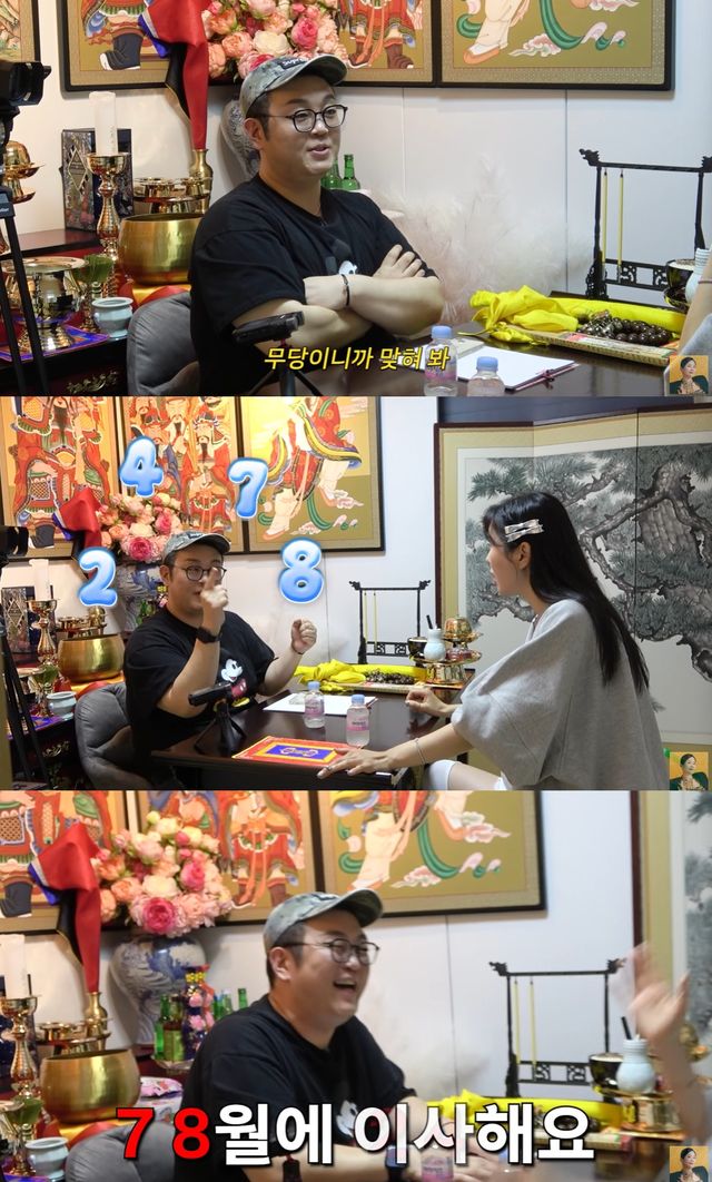 또한 "어떤 분들은 팔짱을 끼고 무당이니 맞추라고 한다. 그래서 '할머니 보여주세요' 하고 부채를 흔드는데 숫자 2, 4, 7, 8이 보이더라"라며 "말했더니 '어머!'하신다. '저 7, 8월에 이사한다'며 의심을 푸셨다"고 덧붙였다.