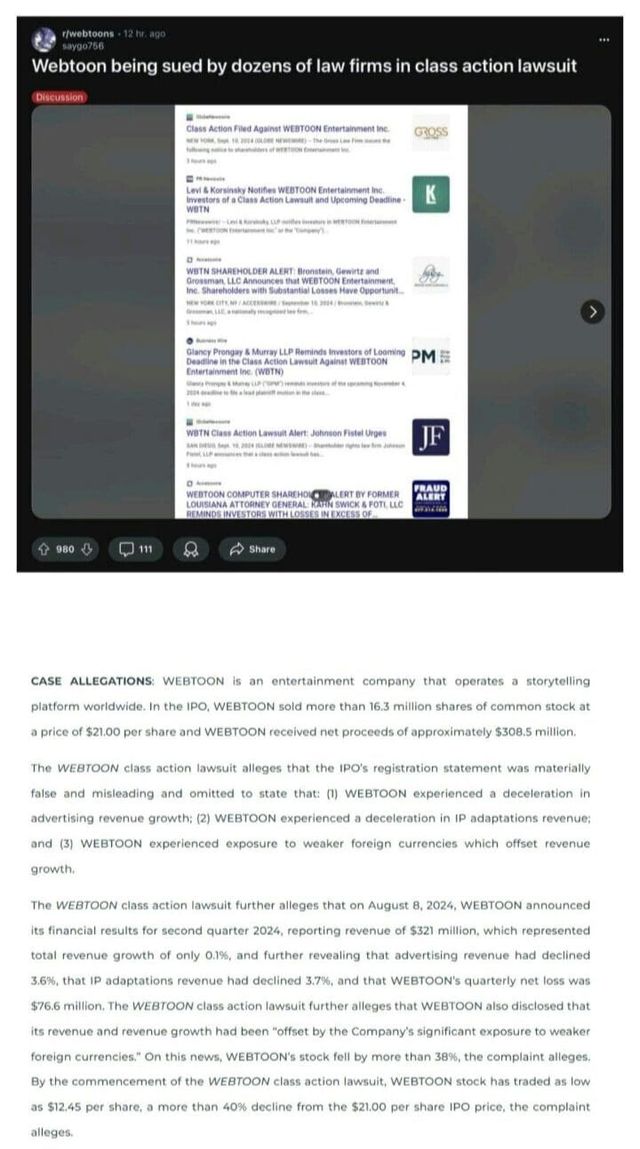 네이버 웹툰이 다음과 같은 불리한 정보를 숨겼기 때문에 로펌 수십개에서 집단고소 한다고 함