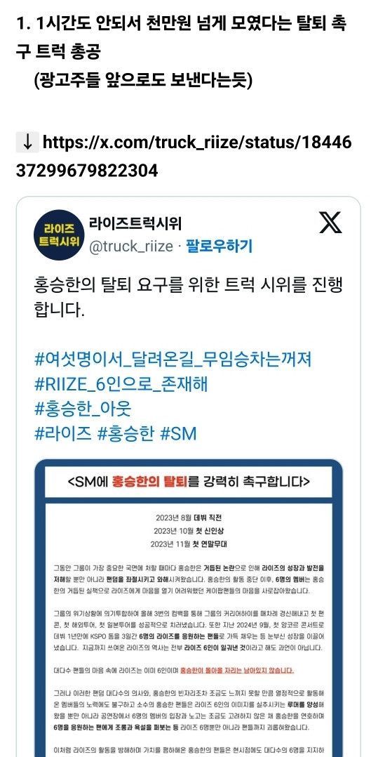 즉 승한 없이 활동해온 라이즈를 좋아해 온 팬들도 적지 않은 상태. 이들은 현재 상황에 크게 반발하며 “복귀하면 나는 탈덕하겠다”거나 “쟤 때문에 맨날 내려치기 당하고 욕먹었는데 왜 돌아오냐”고 비판을 이어갔다.