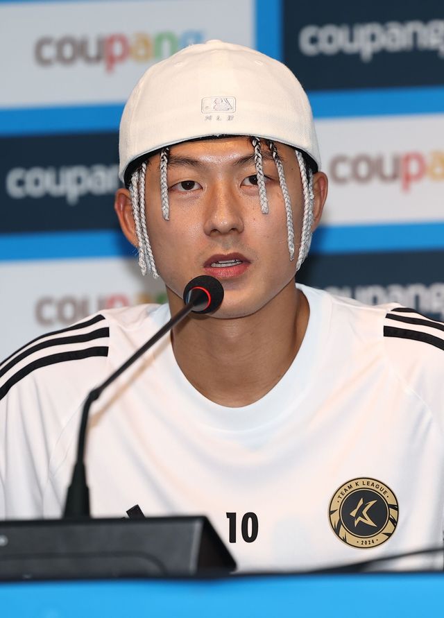 2024 쿠팡플레이 시리즈 토트넘과 팀 K리그의 경기를 하루 앞둔 지난 7월 30일 서울월드컵경기장에서 열린 프리 매치 기자회견에서 팀 K리그 이승우가 취재진 질문에 답하고 있다. / 연합뉴스