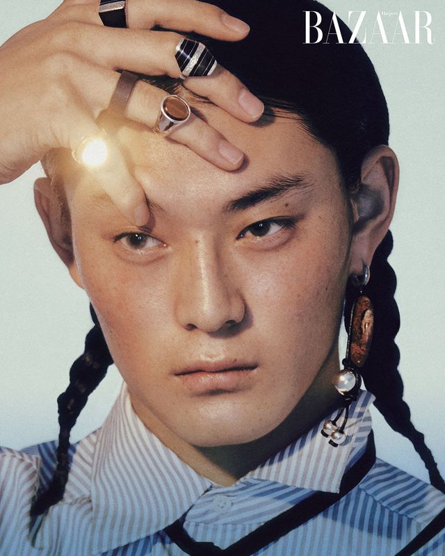 뿔 모티프에 아고야 진주를 장식한 ‘데인저 호른 다이아몬드 파베’ 귀고리는 2백18만원 Tasaki. 진주 목걸이는 2백18만원 Louis Vuitton. 튀르쿠아즈가 돋보이는 비즈 목걸이, 깃털 펜던트 장식 목걸이는 각각 4만원대 Knd. 레이어드한 블랙 오닉스 펜던트 목걸이는 50만원대 Tom Wood. 왼팔에 착용한 장미 모티프 팔찌는 McQueen by Seán McGirr. 왼손 약지에 착용한 반지는 2만원대 H&M. 오른손 소지에 착용한 반지는 Zara. 프린트 셔츠는 Gucci. 오버올은 Sacai. 스트로 소재 모자는 63만원대 Nozomi Kurokawa by W2kend Shop.