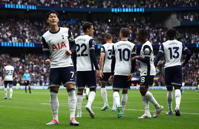 토트넘 주장 손흥민이 지난 8월 영국 런던의 토트넘 홋스퍼 스타디움에서 열린 에버턴과의 2024~25 잉글랜드 프리미어리그(EPL) 2라운드에서 골을 터뜨린 뒤 기뻐하고 있다. AFP=연합뉴스