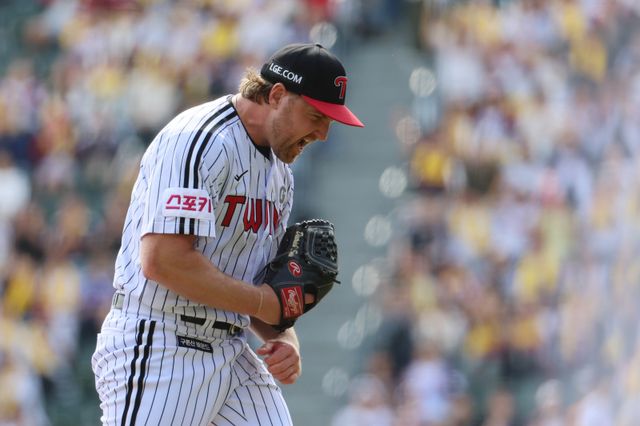 (서울=연합뉴스) 신현우 기자 = 5일 서울 잠실야구장에서 열린 2024 신한 SOL뱅크 KBO 포스트시즌 준플레이오프 1차전 kt wiz와 LG 트윈스의 경기. 1회초 2사 LG 선발 엔스가 kt 장성우를 삼진으로 잡아내며 이닝을 마친 뒤 포효하고 있다. 2024.10.5 nowwego@yna.co.kr/2024-10-05 14:39:53/ <저작권자 ⓒ 1980-2024 ㈜연합뉴스. 무단 전재 재배포 금지, ai 학습 및 활용 금지>