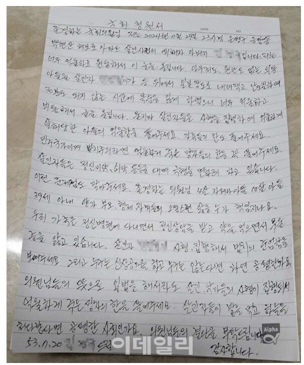 김씨는 탄원서에서 “아무 죄도, 원한도 없는 외동아들을 등 뒤에서 일본 장도로 내리찍고 난도질해 30분도 되지 않는 시간에 목숨을 잃게 했으니 너무 억울하고 비통해서 글을 올린다”면서 “묻지마 살인자들을 사형집행해 억울하게 살해당한 아들의 억울함을 풀어달라”고 했다. 이어 “민주국가이며 법치주의라면 억울하게 죽은 망자들의 한을 꼭 풀어달라”면서 “살인자들은 정신 미약 등을 대며 극형을 면하게 하고 있는데 이런 문제점도 막아달라”고 덧붙였다.