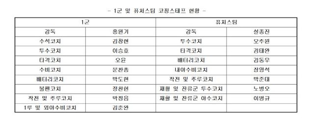 한편, 1군 수비코치를 맡았던 권도영 코치는 11월까지 코치직 수행 후 12월부터 스카우트팀에 배치된다. 이번 시즌까지 1군 불펜코치와 퓨처스팀 내야수비코치를 담당한 마정길, 채종국 코치는 재계약하지 않기로 했다.