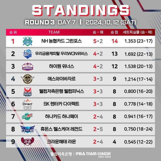 NH농협카드는 5승 2패로 승점 14를 기록하며 1위를 유지했다. 우리금융캐피탈은 4승 3패로 승점 14로 2위, 하이원리조트는 4승 3패로 승점 13으로 3위에 올랐다.