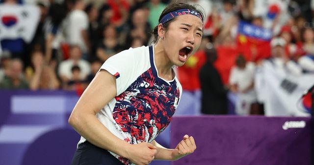 지난 8월 5일(현지 시각) 프랑스 파리 포르트드 라 샤펠 아레나에서 열린 2024 파리올림픽 배드민턴 여자 단식 결승전에서 한국 안세영이 중국 허빙자오를 이기고 우승을 확정한 뒤 기뻐하고 있다. / 연합뉴스