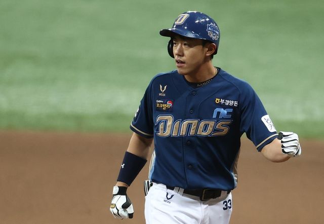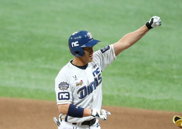 2020년 11월 20일 서울 고척스카이돔에서 열린 2020 프로야구 포스트시즌 한국시리즈(KS) 3차전 NC 다이노스와 두산 베어스의 경기에서 4회초 2사 만루 상황에서 NC 이명기가 1타점 적시타를 친 뒤 기뻐하고 있다. / 연합뉴스