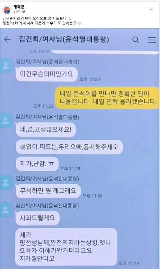 명씨가 SNS에 올린 캡처 사진에 따르면, 김 여사는 명씨를 ‘선생님’으로 존칭하며 깍듯하게 대화한다.