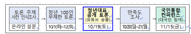 토론회는 통합위 청년위원 100명이 참여해 '사전인식조사 → 주제 별 사전 무제한 토론 → 주제 별 대표토론자 선발 → 오프라인 청년대표 공개토론 → 사후 인식조사' 순서로 진행될 예정이다.