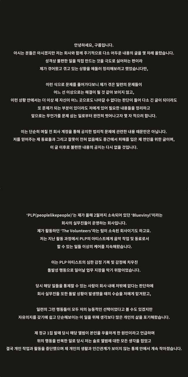 구름은 지난 활동 과정에서 'PLP의 아티스트'에게 "음악 작업 및 동료로서 할 수 있는 일들 이상의 케어를 지속해 왔다. 이는 아티스트의 심한 감정 기복 및 감정에 치우친 돌발성 행동으로 일어날 업무 지장을 막기 위함이었다"라며 "새 연인이 생긴 후에도 눈뜰 때부터 잠들 때까지 아티스트와 관련한 일로 개인은 물론, 실무진들과도 계속 연락을 유지해야 했으며, 그 과정에서 아티스트는 '어차피 결혼은 나랑 할 건데', '그 여자애 계속 만날거야?' 등 저와 연인을 존중하지 않는 메시지를 보냈다"라고 설명했다.