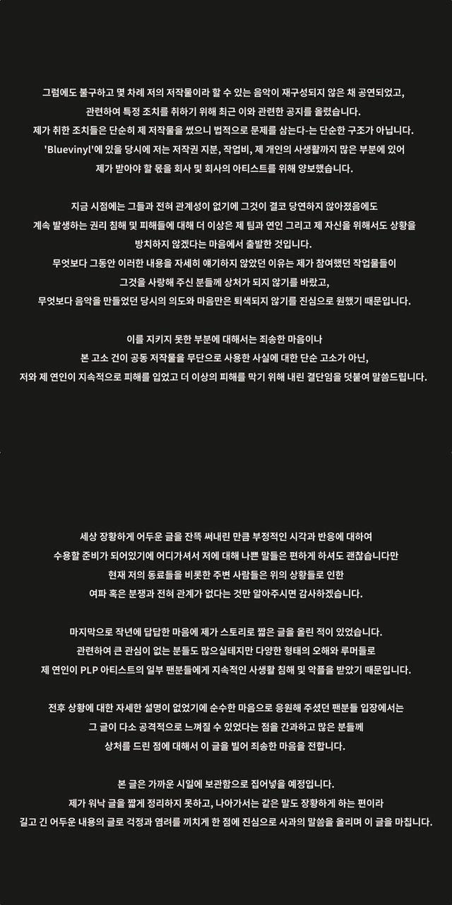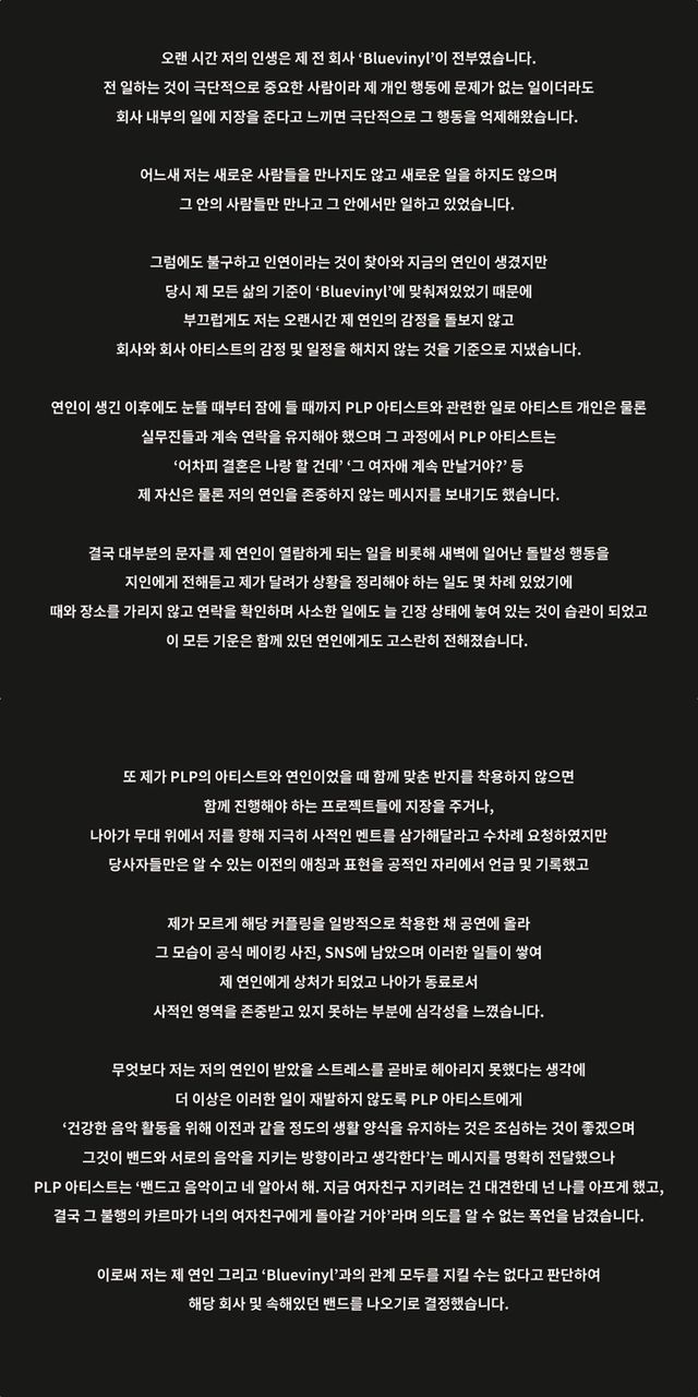그는 자신과 PLP 아티스트가 과거 연인이었다가 결별한 사이라는 것을 고백하며 "연인이었을 때 함께 맞춘 반지를 착용하지 않으면 프로젝트에 지장을 주거나, 사적인 멘트를 공적인 자리에서 언급하거나 기록하고, 제가 모르게 커플링을 일방적으로 착용한 채 공연에 오르는 등 일이 쌓여 연인에게 상처가 되었고, 동료로서도 사적인 영역을 존중받지 못하는 부분에 심각성을 느꼈다"라며 피해를 고백했다.