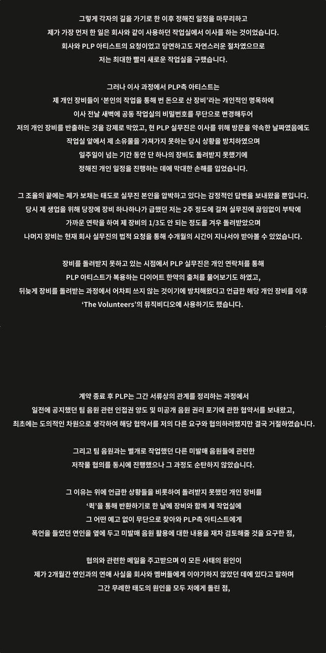 이러한 상황에도 PLP 실무진은 자신에게 아티스트의 사적 영역에 대한 질문을 이어갔고, 일정에 지장을 주는 행동을 이어갔다고 밝히며 "서로 사생활을 모두 공개하지 않았던 부분을 두고 그간 있었던 모든 책임을 뒤집어 씌우며 현 연인에게 한 각종 폭언과 감정에 따른 돌발 행동, 무례한 태도를 정당화하는 것을 보고 더 이상의 합리적 논의 및 피해에 대한 방치는 불가능하다고 판단했다. 더 이상의 피해를 막기 위해 내린 결단"이라며 글을 올리게 된 상황을 전했다.