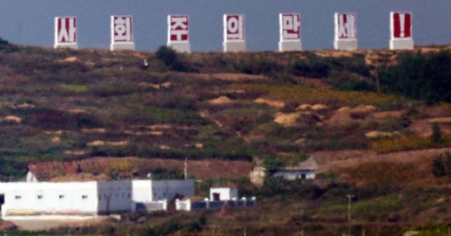자료사진. 북한이 우리나라를 향해 세운 문구. 북한이 남한과 연결된 도로와 철길을 완전히 단절하고 요새화 공사를 진행할 것이라 밝혀 남북 관계 경색이 가속화 되고 있다. 지난 10일 인천시 강화군 교동도에서 바라본 북한 지역이 적막하다. / 뉴스1