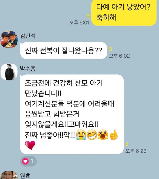 조혜련 또한 이들의 득녀 소식에 기쁨을 표했다. 조혜련은 이날 자신의 개인 계정을 통해 동료들과의 단체방 메신저를 공개했다. 공개된 사진에는 조혜련이 "다예 아기 낳았어? 축하해"라고 보냈고, 김인석은 "진짜 전복이 잘 나왔나용??"이라고 답장했다. 박수홍은 "조금전에 건강히 산모 아기 만났습니다 !! 여기 계신분들 덕분에 어려울때 응원받고 힘받은거 잊지 않을게요!! 고마워요 1! 진짜 넘 조아!!악!!!"이라는 글을 남겼다. 김원효 또한 축하를 건넸다.