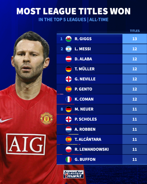 이 부문 단독 1위는 긱스였다. 클럽 커리어 동안 맨유에서만 활약한 긱스는 무려 13번의 리그 우승으로 이 부문 선두에 올랐다. 긱스는 잉글랜드 프리미어리그(EPL) 632경기 나서 108골 163도움을 올렸다. 이 기간 13번의 리그 우승을 맛봤다.