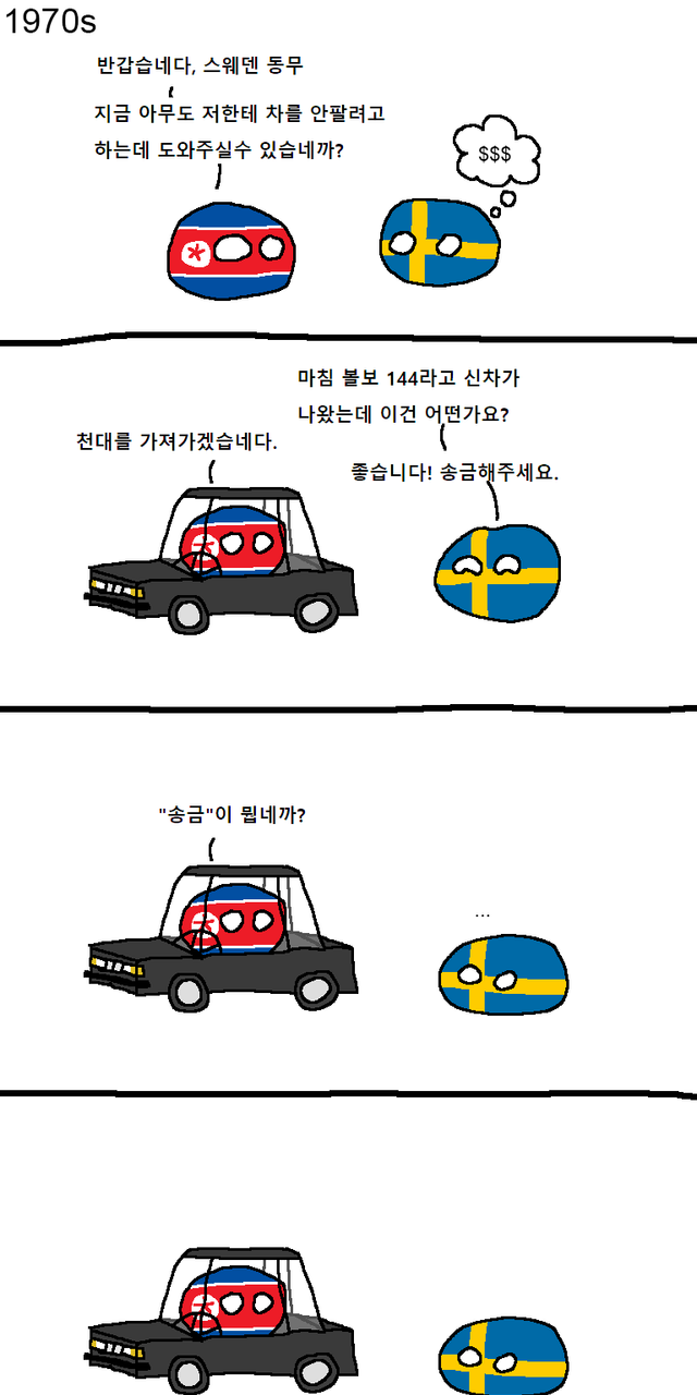 북한은 1970년에 스웨덴한테서 볼보 144 1000대를 샀는데 아직도 그 대금을 못 받았다