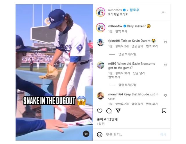 다저스팬들은 더그아웃에 등장한 뱀이 행운을 가져다주길 바랐다. 2차전에서 3-7로 패한 다저스는 17일 뉴욕 시티 필드에서 CS 3차전을 치른다.