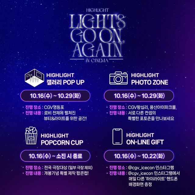 ‘하이라이트: 라이츠 고 온, 어게인 인 시네마’는 CGV에서 절찬 상영중이며 이벤트에 관련된 더 자세한 내용은 CGV 공식 홈페이지 및 앱을 통해 확인할 수 있다.