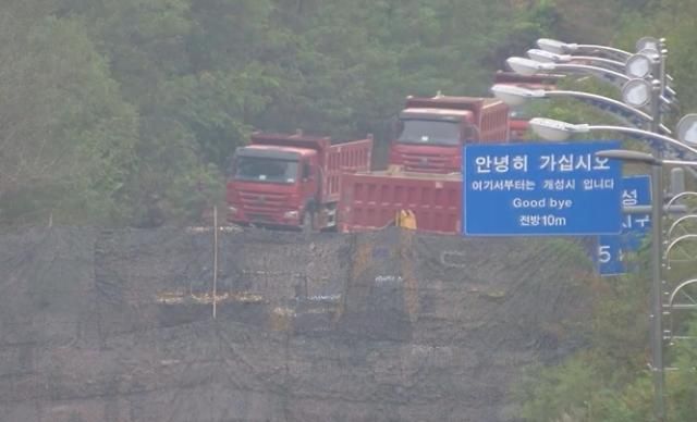 15日,朝鲜爆破连接韩朝的公路北侧部分路段。图为韩军监控拍摄到朝方多辆卡车前往京义线公路。【图片提供 韩联社】