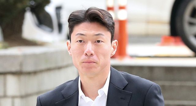 불법 촬영 혐의를 받는 축구선수 황의조가 16일 서울중앙지법에서 열린 성폭력 범죄의 처벌 등에 관한 특례법 위반 혐의 1차 공판에 출석하고 있다. / 연합뉴스