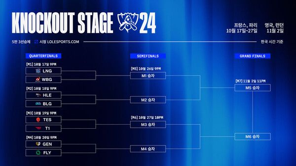 2024 LoL 월드 챔피언십에 LCK 대표로 출전한 한화생명e스포츠와 젠지, T1이 8강 무대에 오른다. 8강전은 17일 LNG 이스포츠와 웨이보 게이밍 간 대결을 시작으로 나흘 동안 프랑스 파리의 아디다스 아레나에서 열린다.