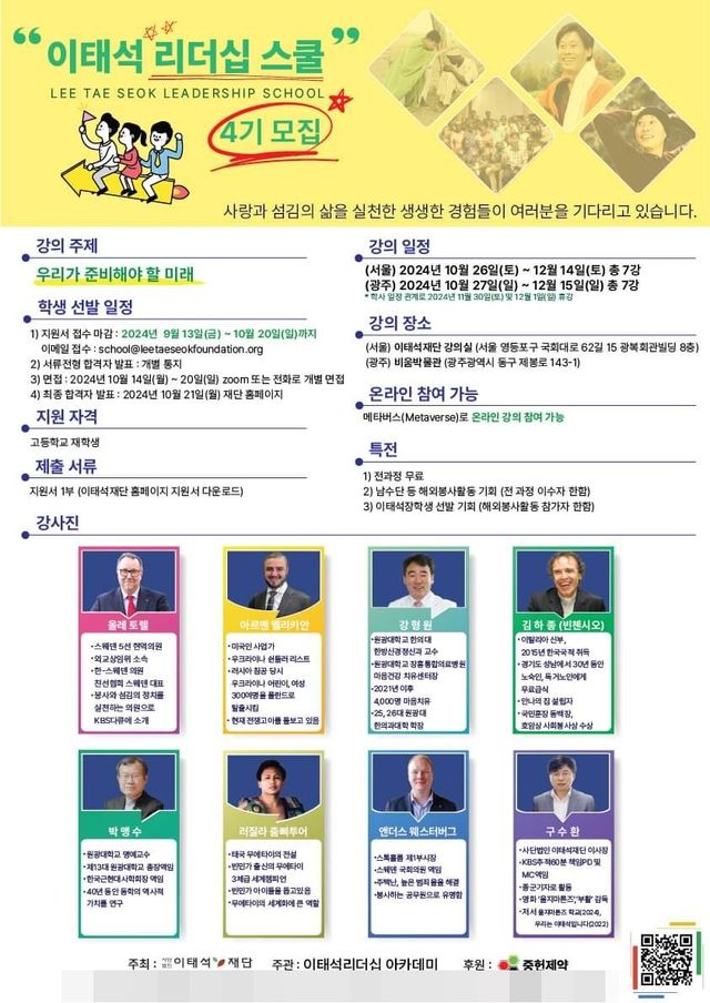 리더십학교 4기는 20일까지 모집한다. 대상은 중3, 고등학생이며 지원 방법은 이태석 재단 홈페이지를 참고하면 된다.