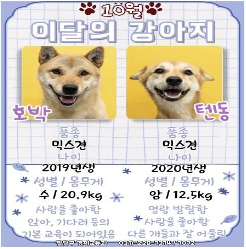 현재 팔달구 홈페이지 화면에서 ‘이달의 강아지’ 배너를 클릭하면 10월의 강아지를 확인해 볼 수 있다. 10월에 소개하는 ‘이달의 강아지’는 믹스견인 호박이와 텐동이다. 구청 방문 시 팔달구청 1층에 있는 전자게시판을 통해 이달의 강아지를 확인할 수도 있다. 팔달구에서는 매월 새로운 유기견을 소개할 예정이다.