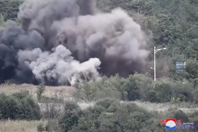 17日,朝中社报道朝方两天前炸毁韩朝公路的消息并公布现场照片。【图片提供 韩联社】