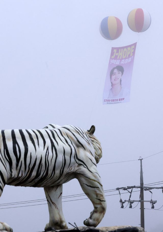 17일 강원 원주시 육군 36사단 신병교육대 상공에 그룹 방탄소년단(BTS) 멤버 제이홉의 전역을 축하하는 대형 풍선이 떠 있다.(사진=연합뉴스)