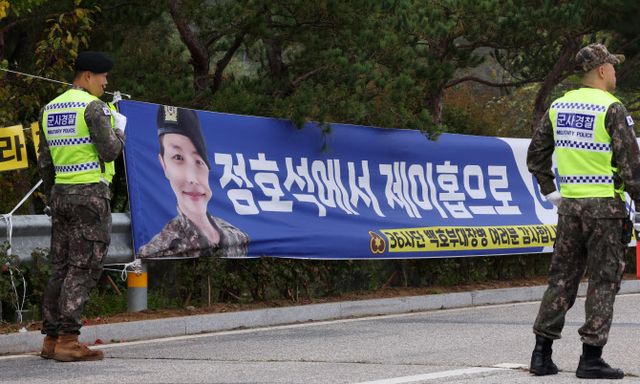17일 강원 원주시 육군 36사단 신병교육대 앞에 그룹 방탄소년단(BTS) 멤버 제이홉의 전역을 축하하는 대형 현수막이 걸려 있다.(사진=연합뉴스)