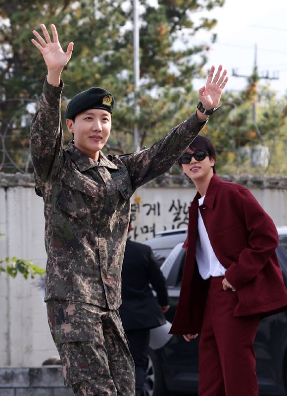 [조이뉴스24 이미영 기자] 그룹 방탄소년단 제이홉이 진의 마중 속 전역했다.