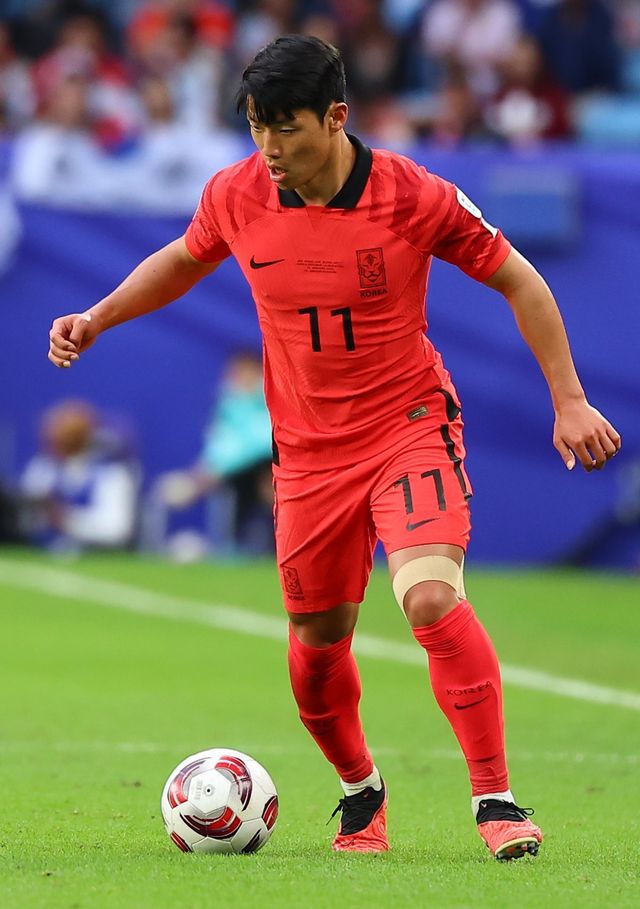 지난 1월 25일(현지 시각) 카타르 알와크라 알자누브 스타디움 열린 2023 아시아축구연맹(AFC) 아시안컵 조별리그 E조 최종전 한국과 말레이시아의 경기에서 부상에서 복귀한 황희찬이 후반 교체 투입돼 드리블하고 있다. / 연합뉴스