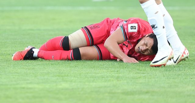 지난 10일(현지 시각) 요르단 암만국제경기장에서 열린 2026 피파 북중미월드컵 아시아 3차 예선 3차전 한국과 요르단의 경기에서 황희찬이 고통을 호소하고 있다. / 연합뉴스
