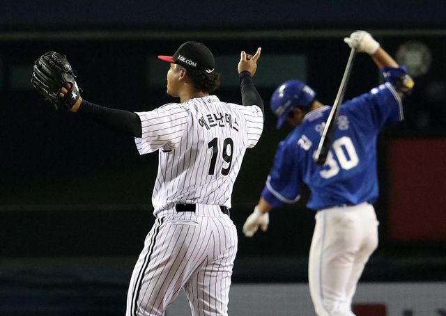 17일 오후 서울 송파구 잠실야구장에서 열린 프로야구 '2024 신한 SOL 뱅크 KBO 포스트시즌' 플레이오프 3차전 삼성 라이온즈와 LG 트윈스의 경기, LG 에르난데스가 9회초 2사 후 삼성 김영웅을 삼진으로 잡아낸 후 기뻐하고 있다. / 뉴스1